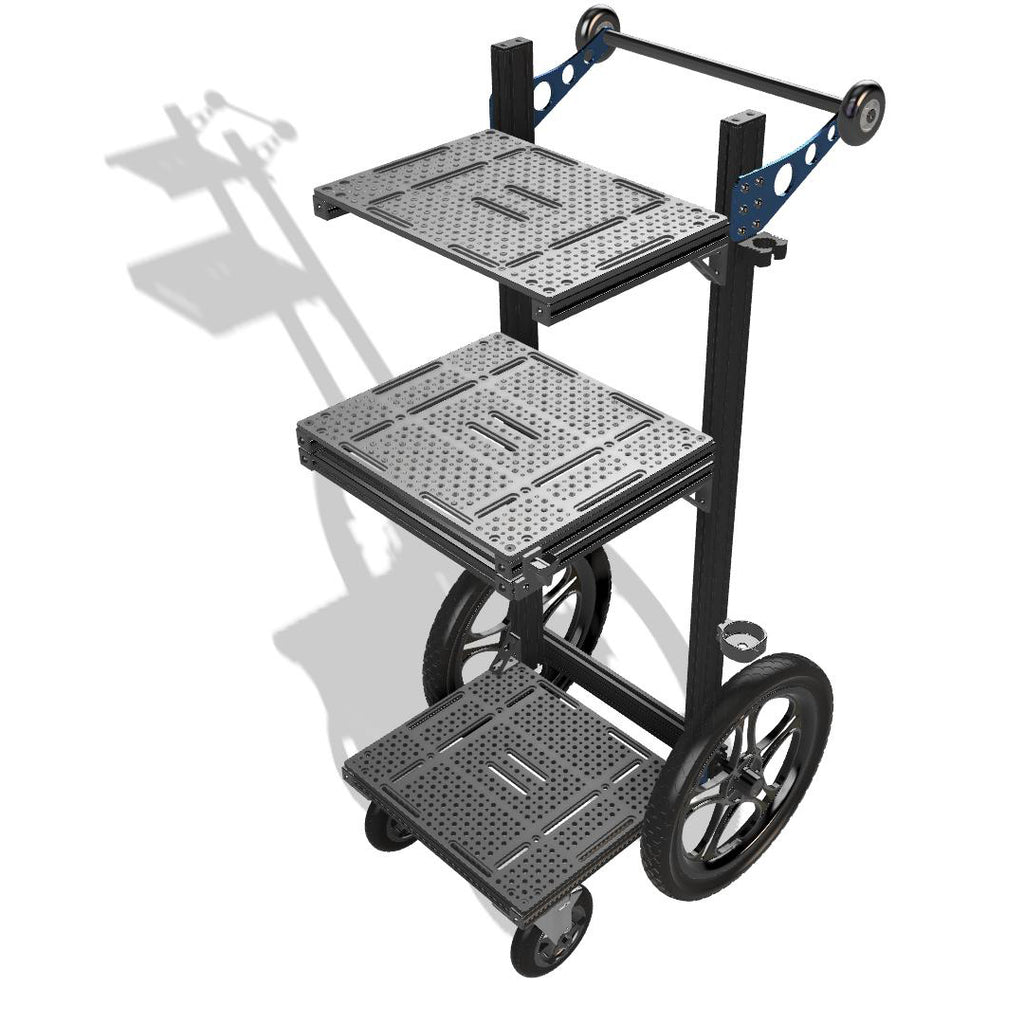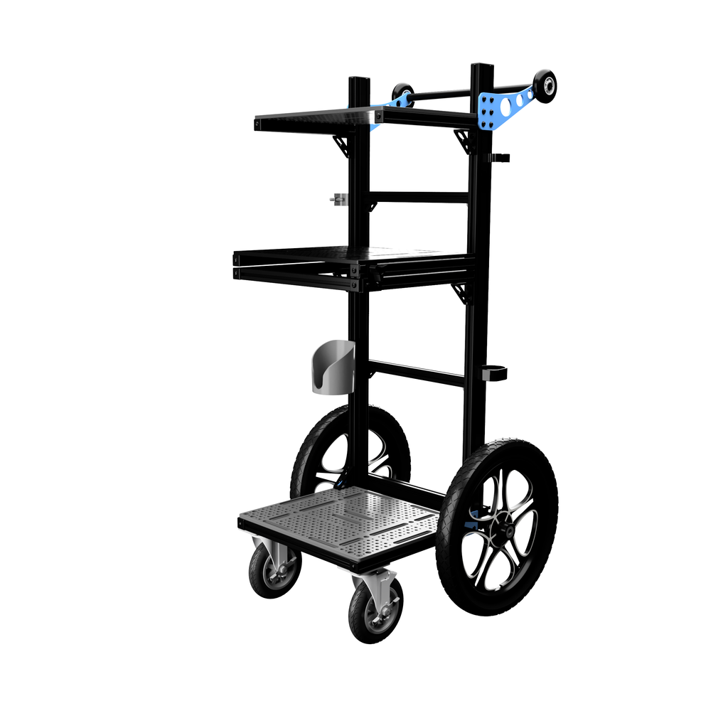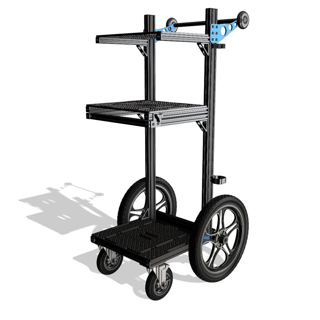 Sleek, Efficient, and Modular. The Meadowlark is perfect for bag work, a mobile DIT station, or the base to build up over time. This cart lets you roll into the gig with everything you need in one trip. Put your storage case on the bottom, the gear up top, and head on in. Upper shelf and Blue Bracket assembly is height adjustable to suit personal needs. The Meadowlark can be transported upright or laid back and rolled on 4 wheels.