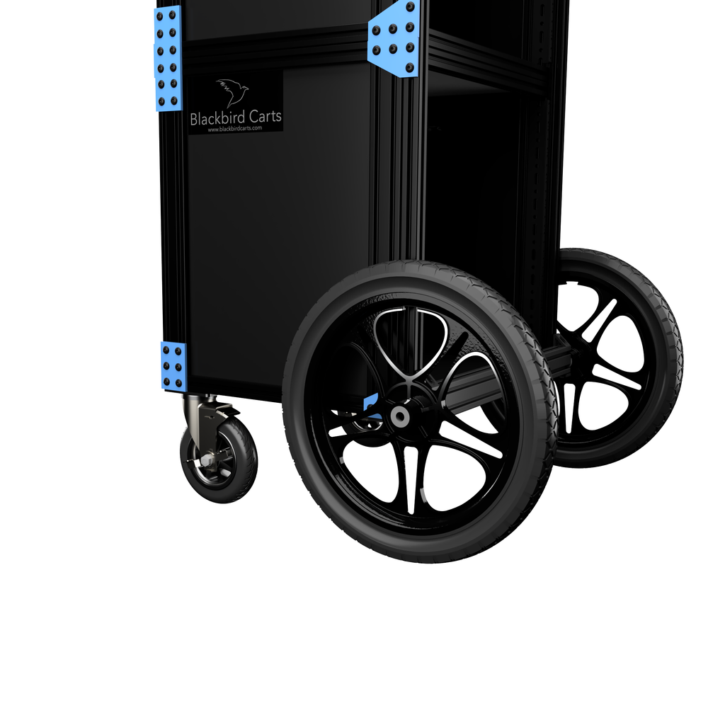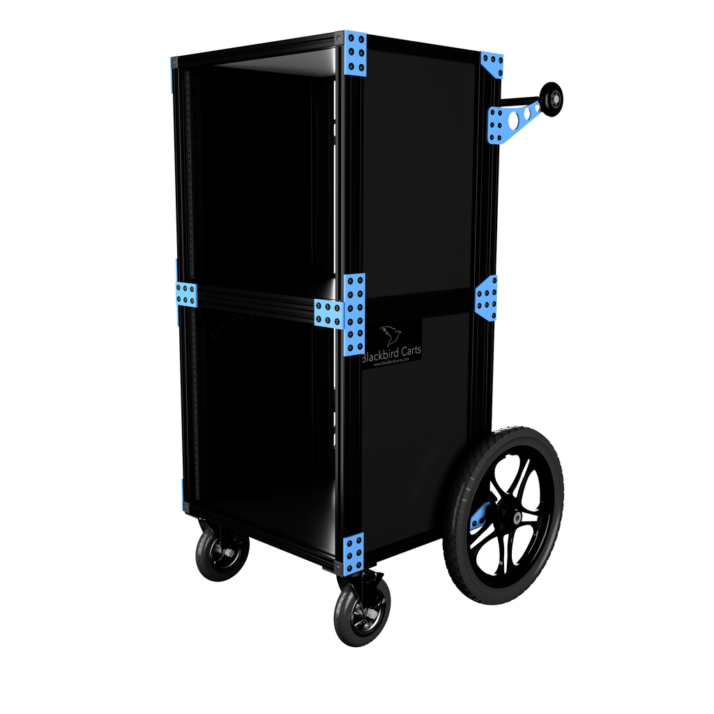 Blackbird Cart's Nighthawk is 20U of mobile sound mixing capability. This beauty sports 10U of rack rails on the top and 10U on the bottom, both in front and back. It rolls on 16 inch pneumatic rear tires and 4 inch blacked out swivel casters. All Blackbird Carts are designed to travel standing up or laying back flat. The top wheels in the back allow for the cart to be tipped back and rolled into any truck, SUV, or hatchback. Of course, you can also strap this thing into a box truck and tie it down for a safe and secure ride.